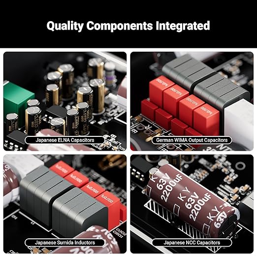 Hi-End Sound Quality: With Texas Instruments’ TPA3255 Class-D power amplifier chip,the V3 amplifier achieves exceptional power efficiency. With audiophile-grade materials, such as Sumida professional audio inductors, NCC high-capacity filter capacitors, German WIMA Output Capacitors, Japanese ELNA Capacitors, etc. Those high-quality components allow V3 to maintain very high stability even under high-power working conditions. With the V3, you can truly have an almost distortion-free music playback experience.