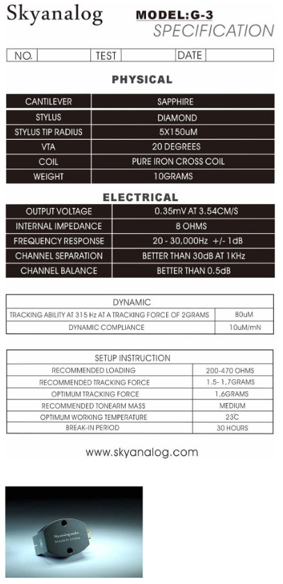 Την στιγμή αυτή, η εταιρία διαθέτει μια σειρά κεφαλών, την G, η οποία περιλαμβάνει τρία διαφορετικά μοντέλα, G1, G2, G3. Όλες οι κεφαλές είναι κινητού πηνίου με γεννήτρια iron cross, όπου χρησιμοποιείται σίδηρος υψηλής καθαρότητας και βασίζονται σε ακίδες από διαμάντι με προφίλ “Super Line Contact”, το οποίο θεωρείται η καλύτερη επιλογή για την απόδοση των πολύ υψηλών συχνοτήτων και την χαμηλότερη δυνατή φθορά των δίσκων. Οι κεφαλές έχουν ίδια ευαισθησία (0,35mV/3,54cm/s) και κοινά χαρακτηριστικά διαχωρισμού και ισορροπίας καναλιών, 30dB/1kHz και >0,5dB αντιστοίχως.